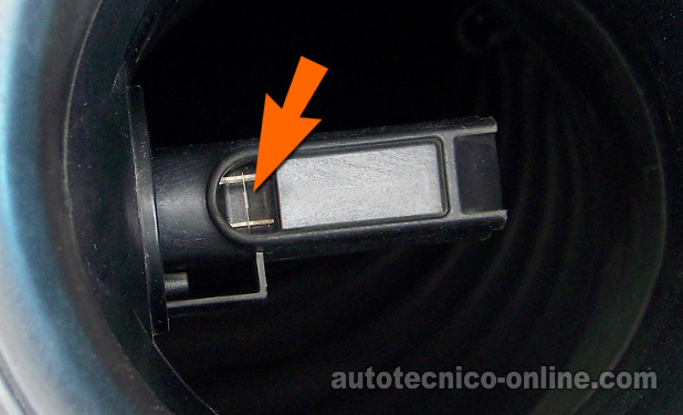 No es necesario remover el sensor MAF de la caja del filtro de aire para limpiarlo. Basta con separar la caja del filtro de aire en dos (cómo se ve en la foto arriba) y exponer los alambres a prueba de calor del sensor MAF para rociarlos con el limpiador.