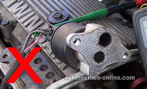 Puedes identificar la válvula EGR que usa tu carro por la base de ella. Si la base de tu válvula EGR electrónica se parece al de la foto con la X roja, entonces este tutorial no aplica a tu vehículo y necesitas ir a este tutorial aquí: Cómo Probar La Válvula EGR De GM (Buick, Chevrolet, GMC, Oldsmobile, Pontiac).