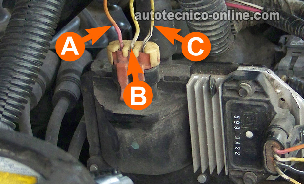 El conector de la bobina de encendido puede tener 3 cables saliendo de él (si es que el carro o la camioneta está equipado con tacómetro). Abajo están las descripciones de la señal que cada uno alimenta. Notarás que cada uno es identificado por una letra, y estas letras también las encontrarás moldeadas en el conector de la bobina de encendido del carro o al camioneta.