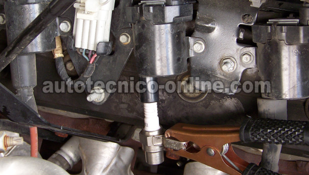 Coloca el probador de chispa directamente en la torre de la bobina de encendido (como se muestra en la foto arriba).