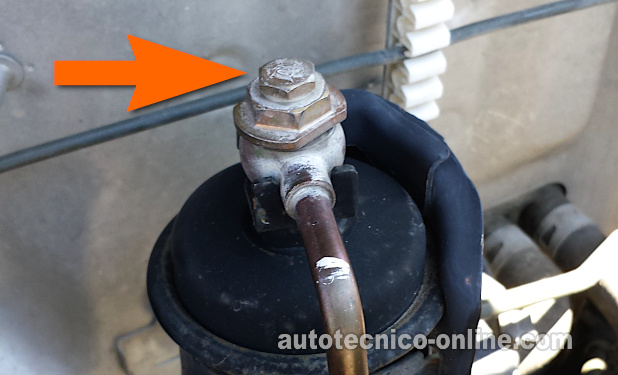 Remueve el perno de 6 mm ubicado en la parte superior del perno banjo del filtro de combustible.