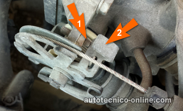 En la foto arriba, el tornillo de ajuste de la marcha mínima (idle stop screw) está identificado con la flecha con el n.º 1. La palanca del acelerador (throttle lever) está identificado con la flecha con el n.º 2.